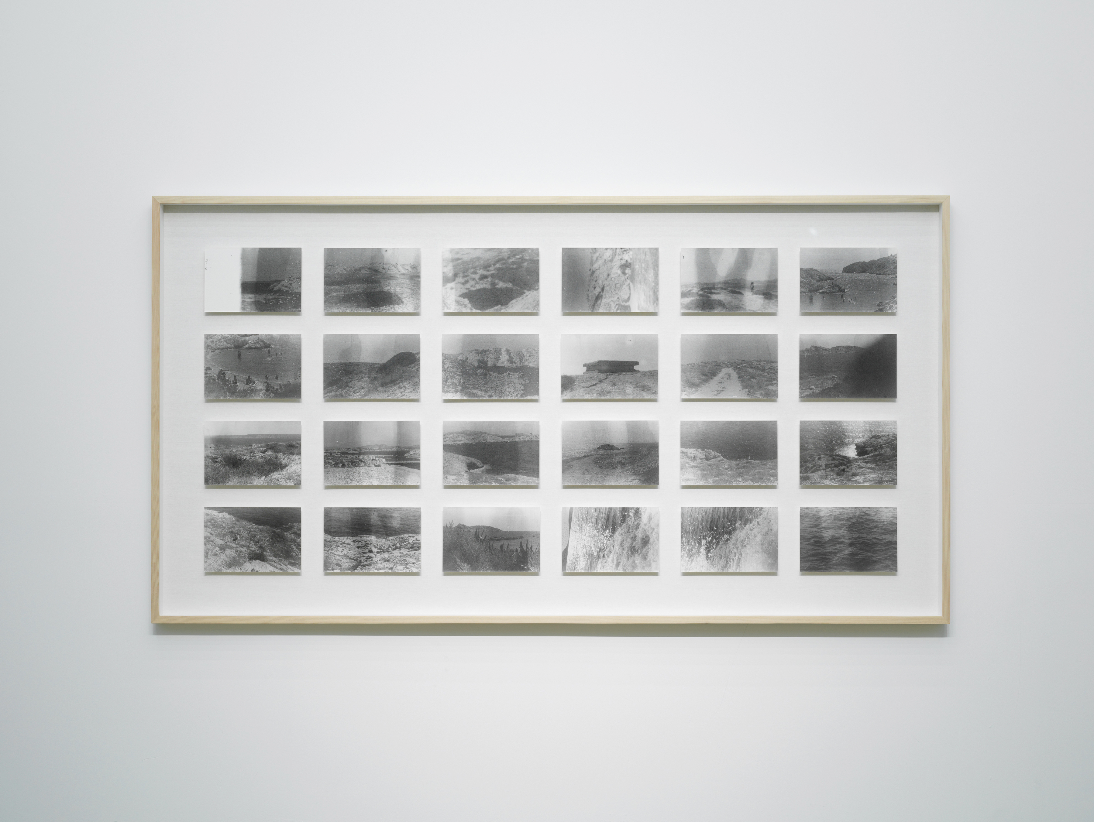 I began to look again at the film of the island. Everything from my visit there was contained in that one roll. I decided to print the 24 frames in my own way. The printing process mirrored what I had gone through: light was cast, the paper was soaked in chemicals, the image surfaced, and was lifted out. The photo paper where the image settled was washed and dried. The island's landscape took hold in shades of gray. In the soft, faint light appeared dry grass, rocks, sea, and sky. The edges of each scene had become blurred. These elements revealed fragments of distant memories, stripped of sequence and time.
